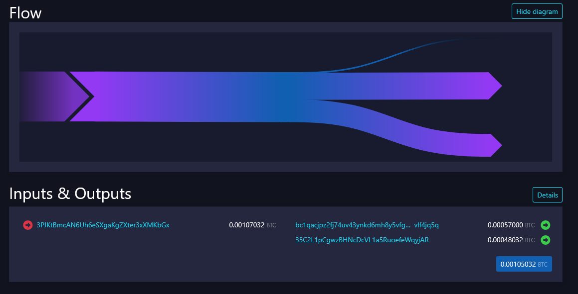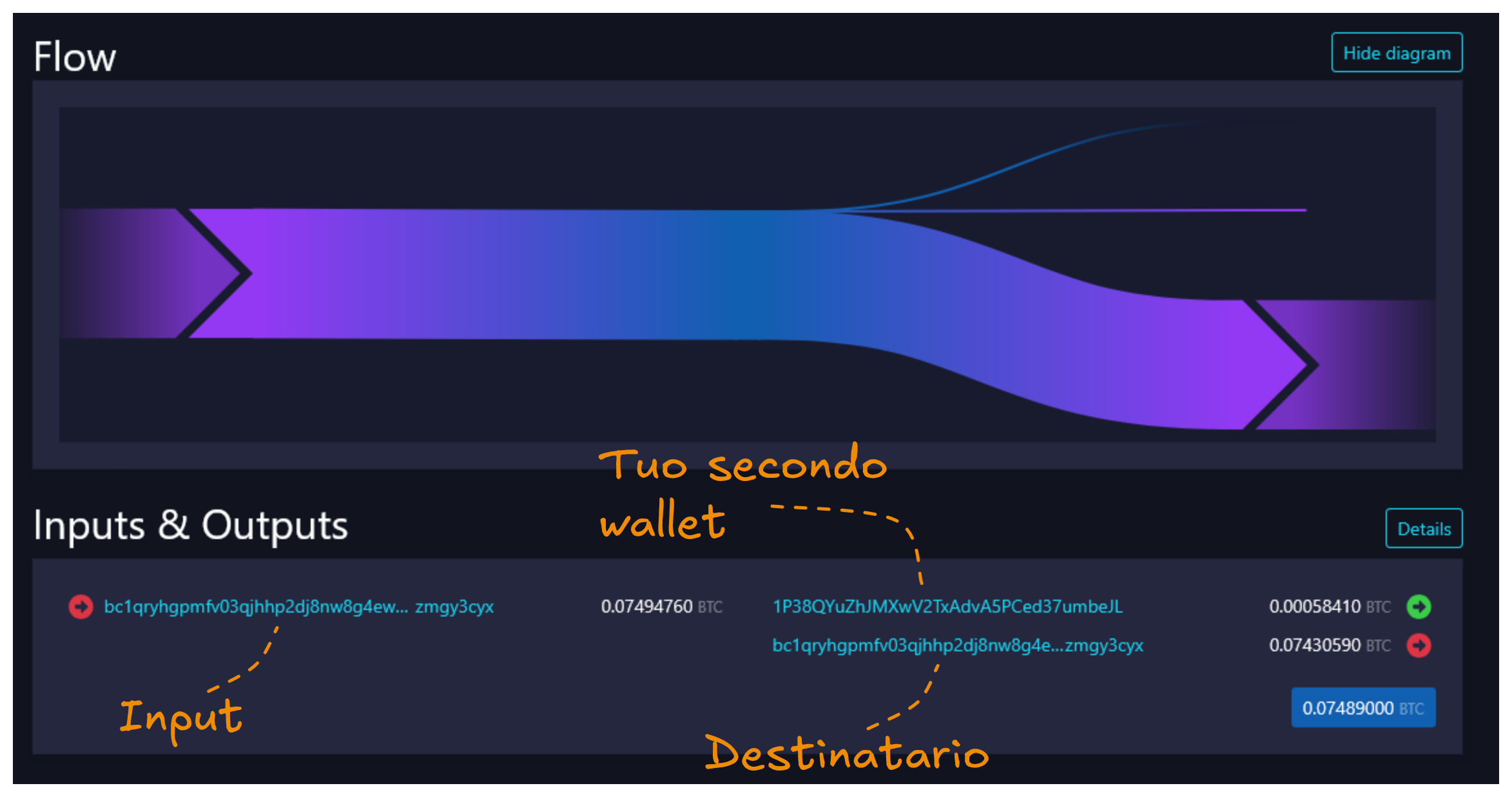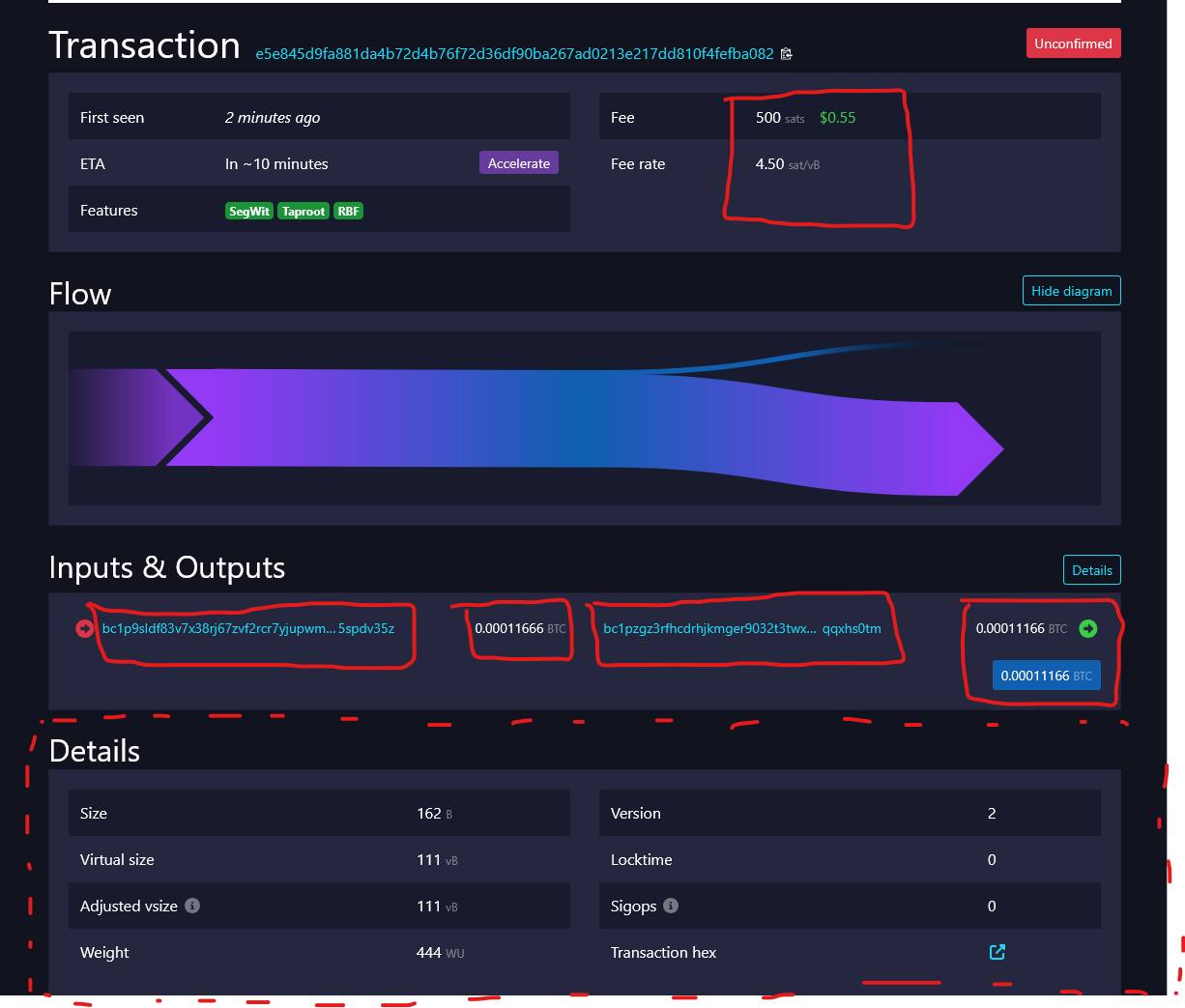 This is an example of a Bitcoin transaction displayed on the blockchain with mempool.space. The data highlighted in red is the sensitive data of a transaction, the elements that fall under so-called fingerprinting: all those indicators that could help identify your transaction.