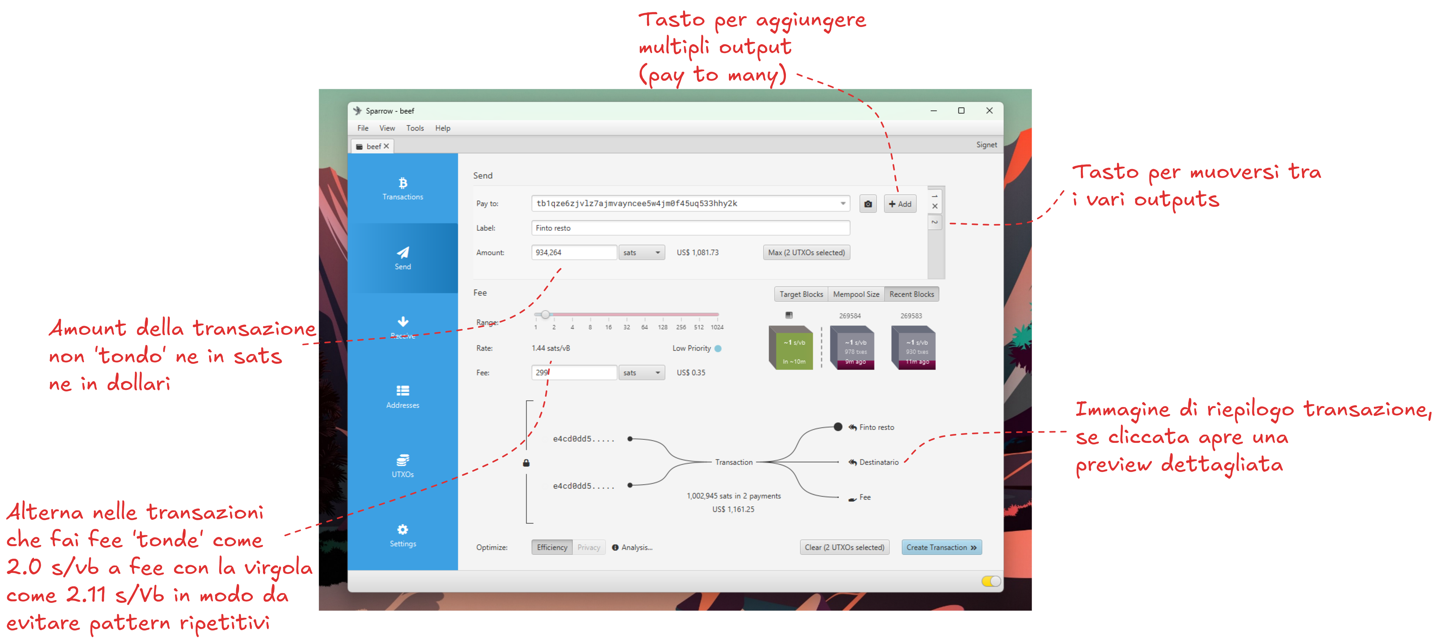 Example of transaction and details to pay attention to while creating it on Sparrow: