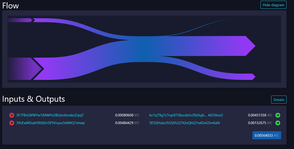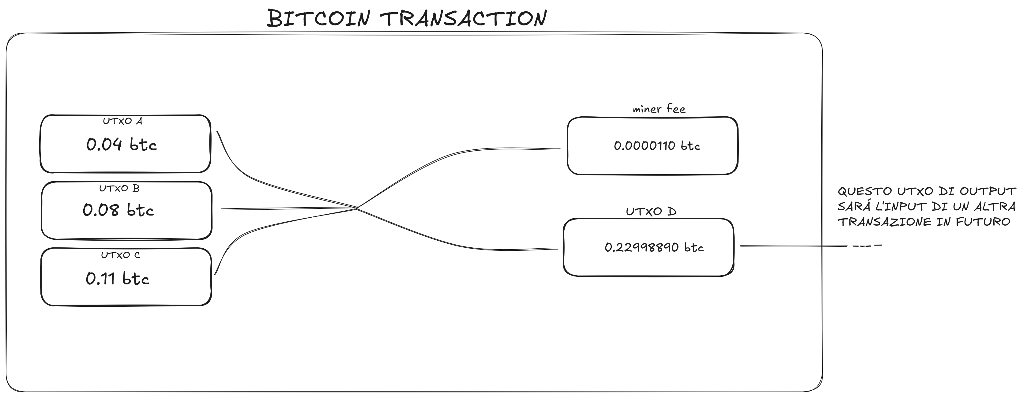 The user is consolidating 3 input UTXOs totaling 0.23 BTC to send another user 0.22998890 BTC, while a small part is allocated to miners as a fee. In the future, when spent, UTXO D will be used as input for another transaction.