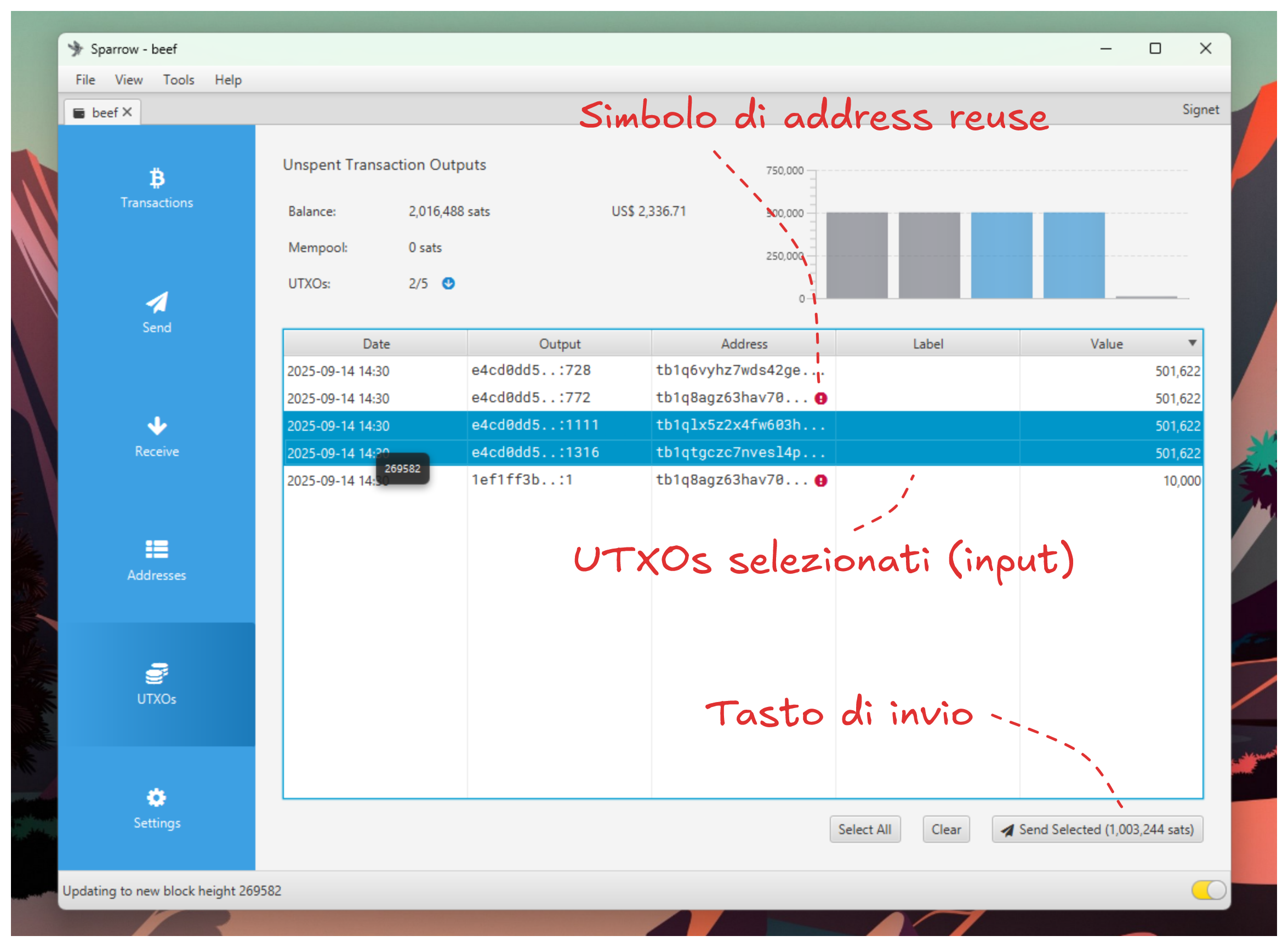 In particular, Sparrow offers simple diagrams, similar to those shown above, to show you how the transaction will be composed. If you don't have much experience with UTXOs yet, I recommend trying Sparrow and mempool.space to observe different transactions and experiment by manually creating yours, selecting inputs.