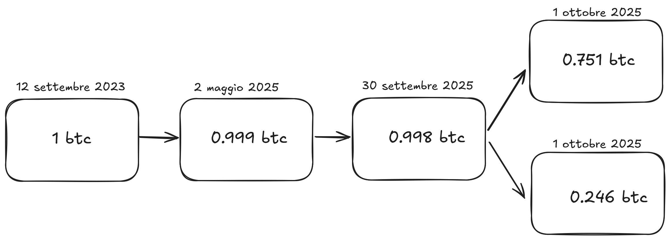 This is a visual example of a series of Bitcoin transactions that, starting from 1 BTC and paying a fee at each step as a reward to miners, move over time.