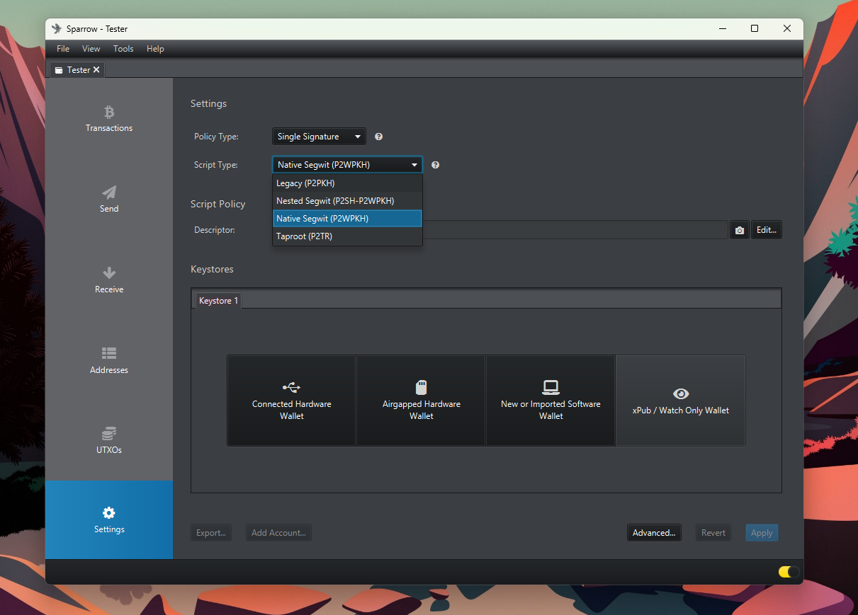 After creating the seed and installing Sparrow (I also suggest verifying the PGP signatures of the software: on the download page you'll find a dedicated tutorial), you can proceed to choose the type of script best suited to your needs.